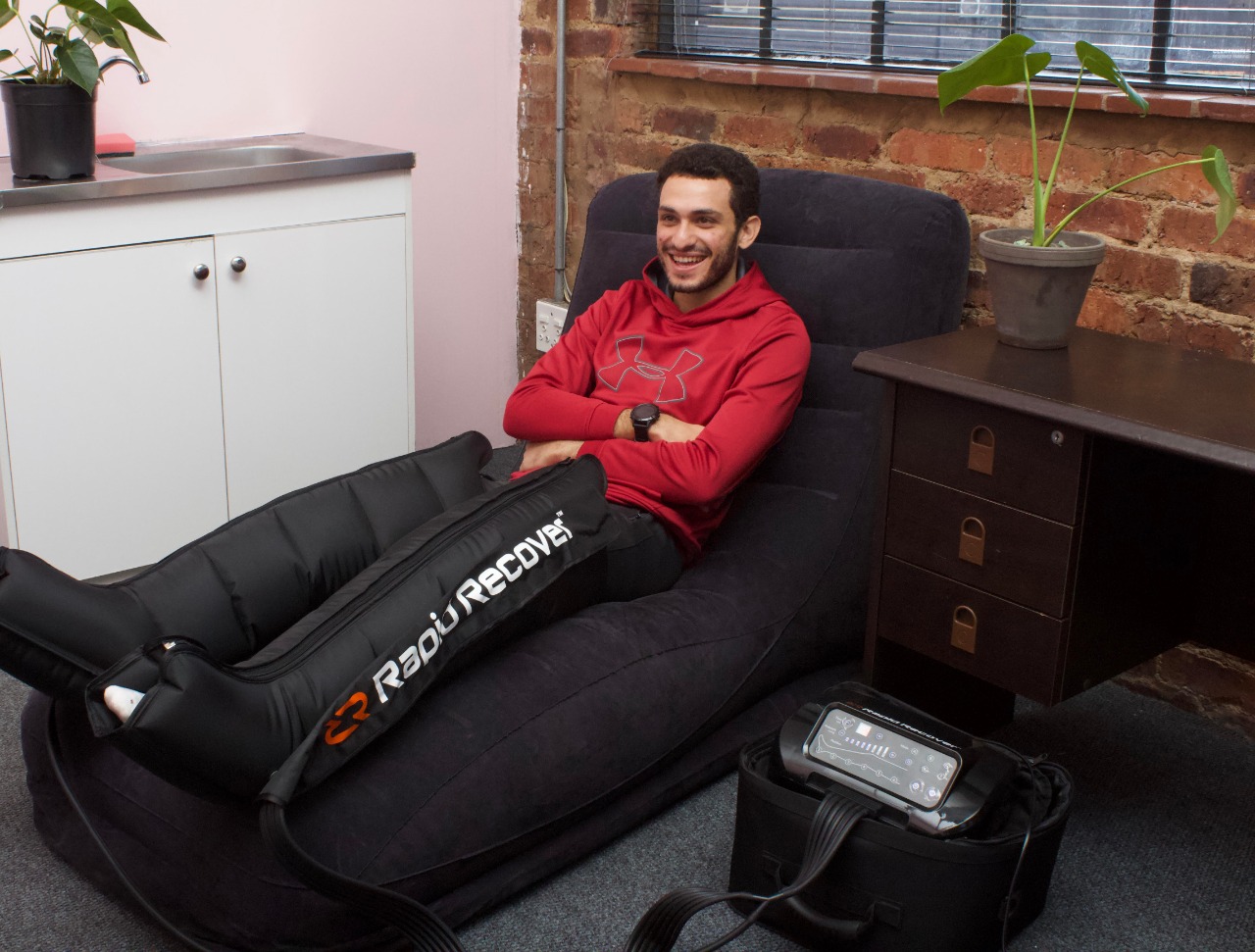 Leg sleeves used to increase circulation in a patient’s limbs. This results in inflammatory fluid removal and lactic acid flushing that leads to nutrient-rich blood circulation to tissues in need of repair and restoration. A higher efficient recovery of muscles overall.